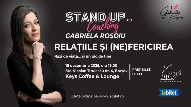 🎤 Stand-up coaching relațiile și (ne)fericirea cu Gabriela Roșoiu: joi, 18 decembrie, ora 19:00, la Keys Coffee & Lounge. Descoperă cum să navighezi cu umor și înțelepciune prin relații și fericire alături de Gabriela Roșoiu. Bilete aici.